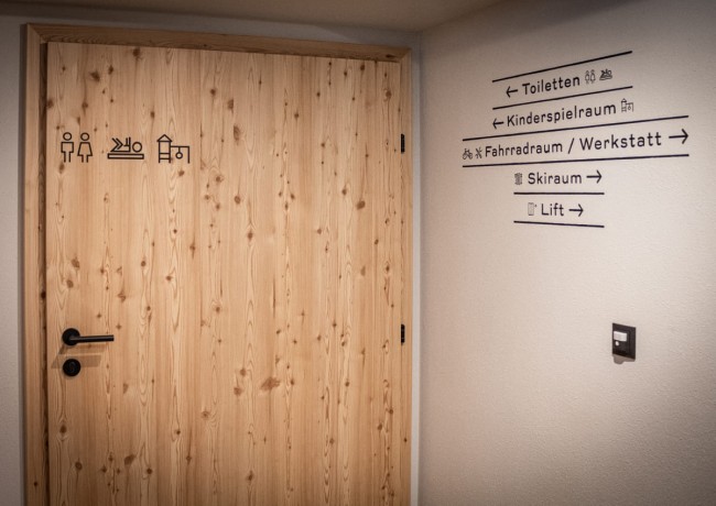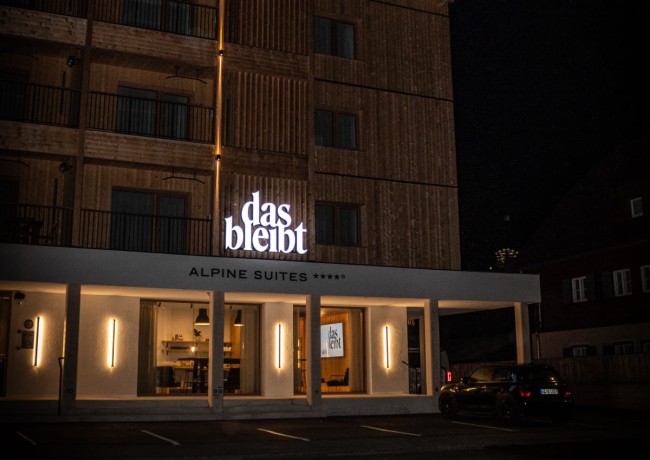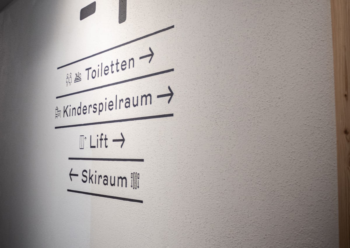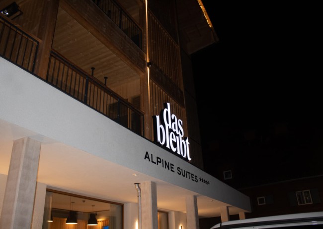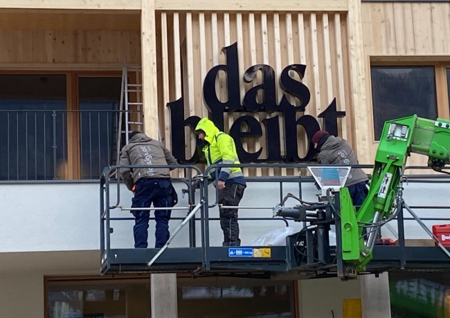 Die LED-Schrift von „Das Bleibt“ leuchtet über die Schladminger Straßen und die Verklebungen indoor sorgen für Orientierung und Wohlbefinden. 3D-Buchstbaen aus speziellem Schwarzstahl passen genau zum Design des Hotels, und die Sichtschutzbeklebungen aus hochwertiger Satinato-Folie verleihen einen edlen Touch.